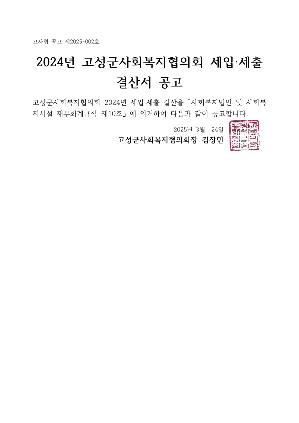 2024년 고성군사회복지협의회 세입세출 결산서 공고